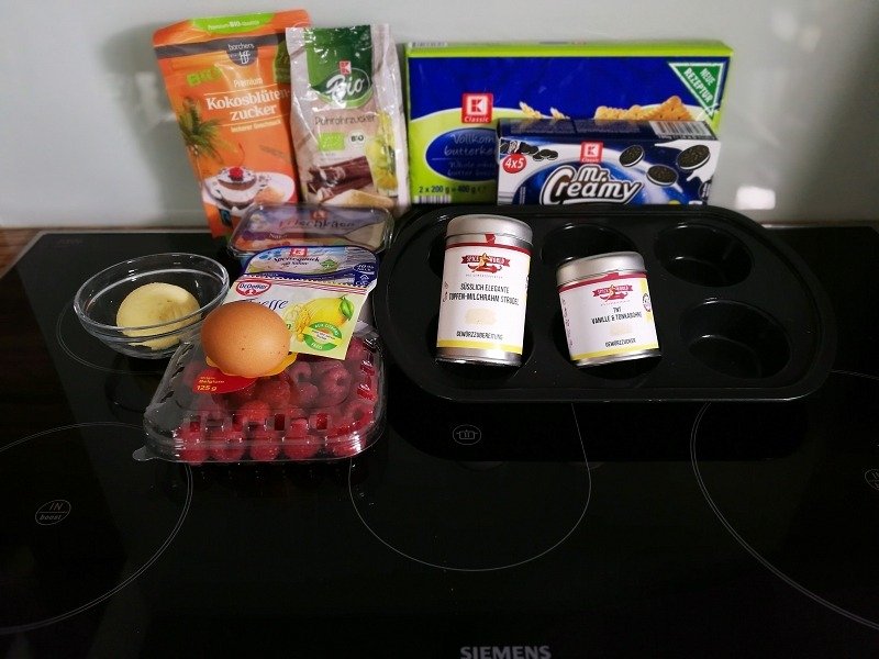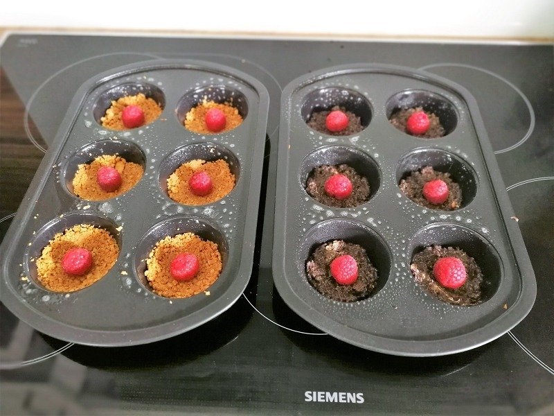 - Den Teig auf alle Förmchen gleichmäßig verteilen und andrücken, optional können an dieser Stelle auch noch Früchte hinzu gegeben werden. Wie auf dem Bild zu sehen, kann der Boden auch mit zerstoßenem Oreokeks gemacht werden.