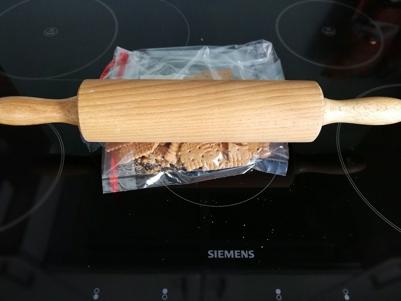 - Zuerst die Butterkekse in einen Gefrierbeutel geben und mit Hilfe eines Nudelholzes zu Brösel verarbeiten.