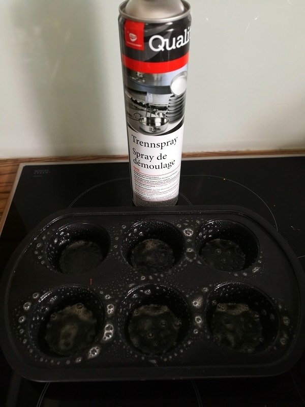 - Nun die Spitze des Beutels ca. 1-1,5cm aufschneiden und die Masse gleichmäßig auf alle Förmchen verteilen.