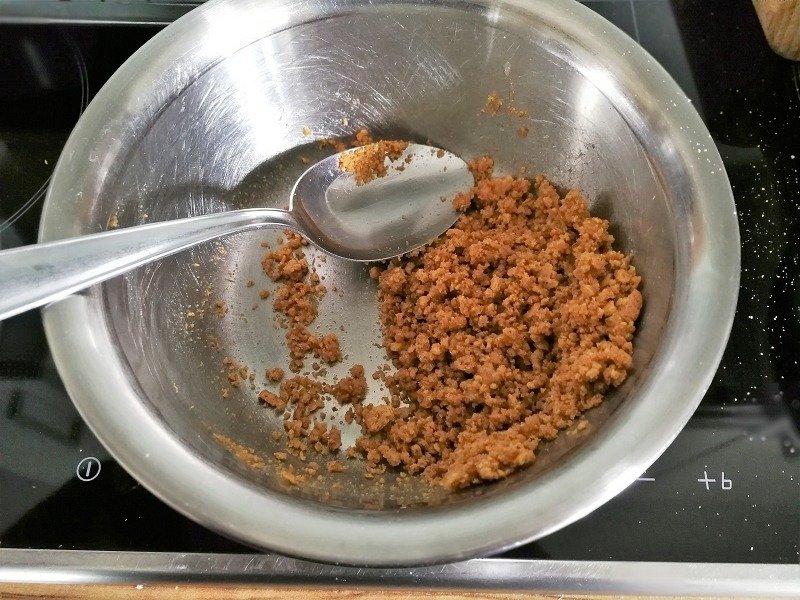 - Zusammen mit der geschmolzenen Butter und dem Zucker zu einem krümeligen Teig verarbeiten.