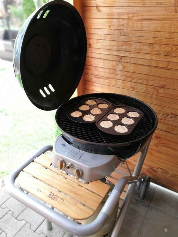- Jetzt kommen die Muffins bei gut 200-220 Grad für ca. 30 min in den vorgeheizten Grill, der Grill muss dabei auf indirektes Grillen hergerichtet sein.