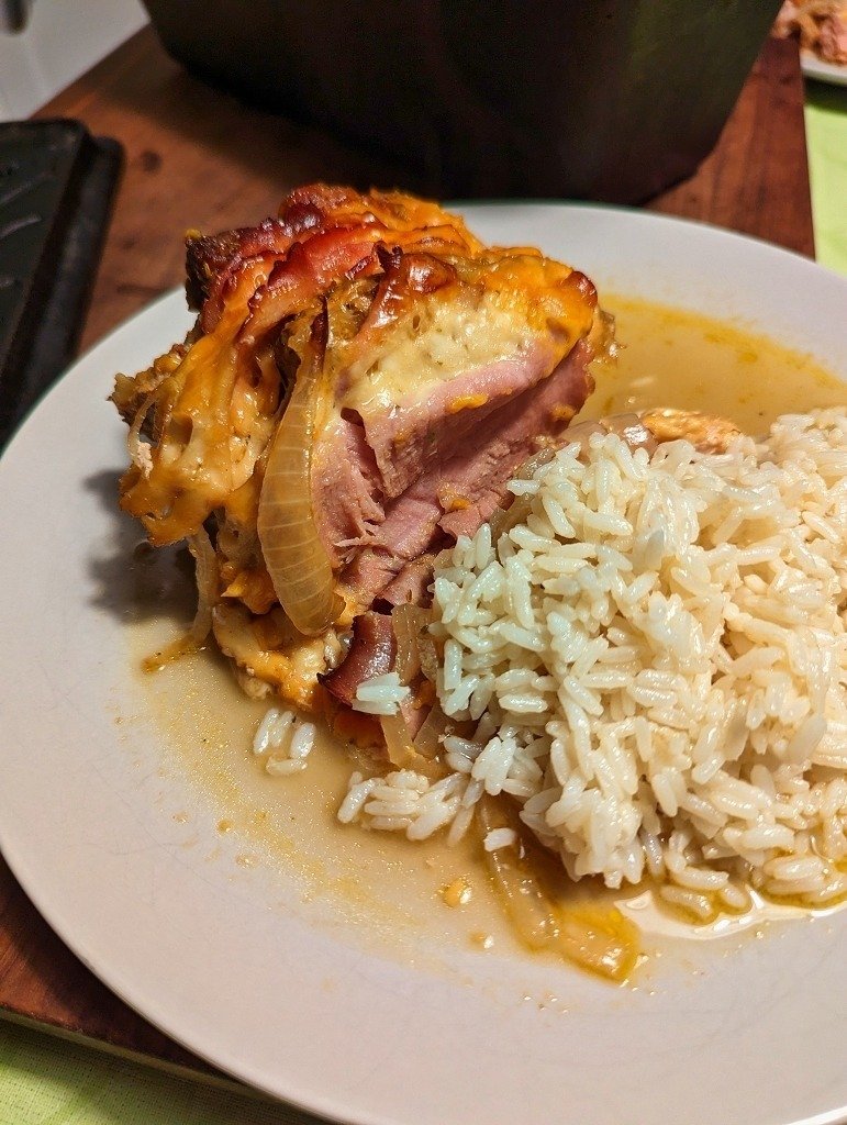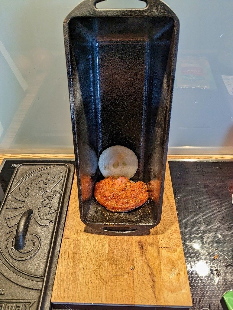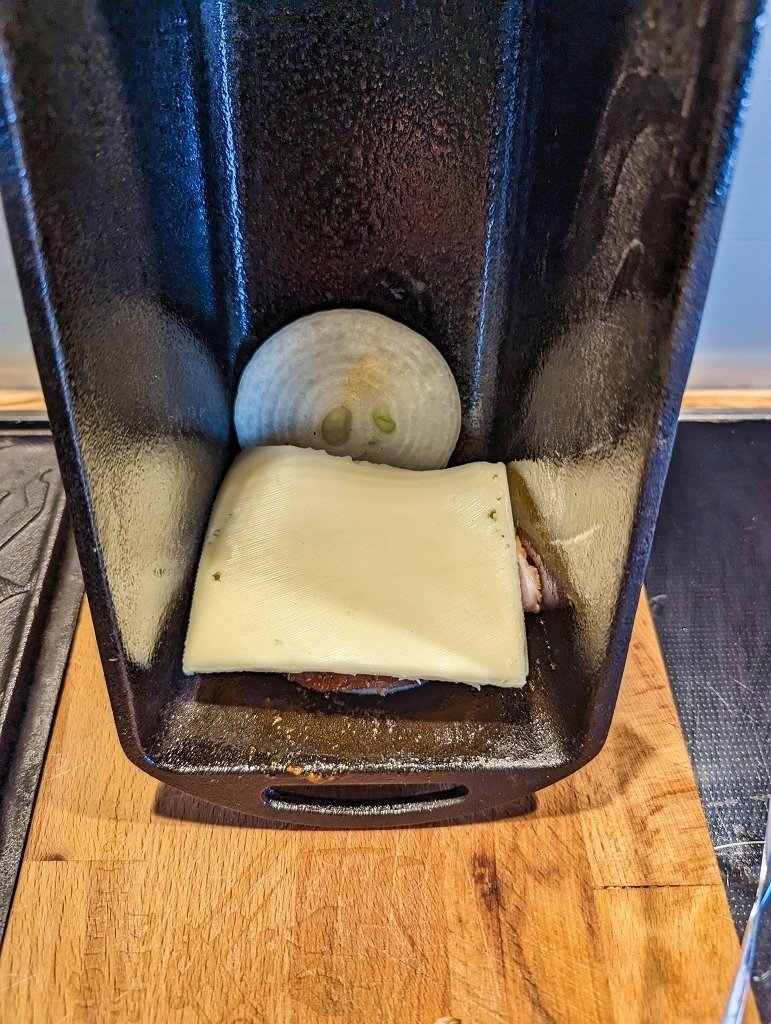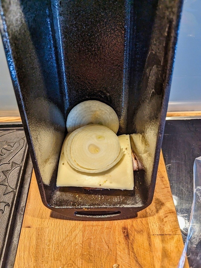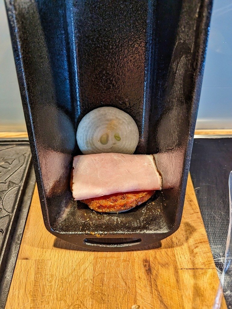 - Darauf eine Scheibe Schinken und Fleisch, und am Boden eine Scheibe Zwiebel