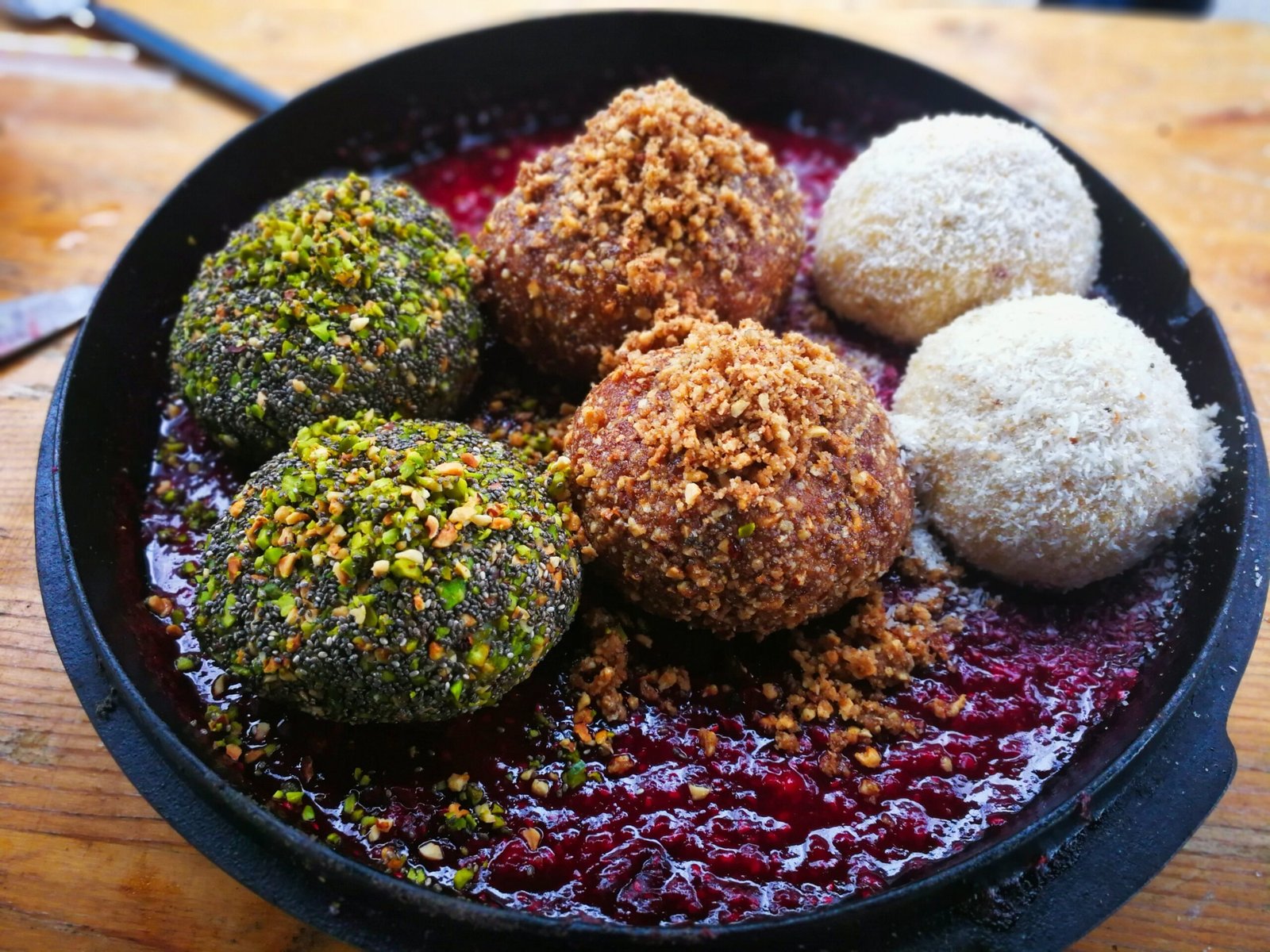 - Für die Nougatknödel die geschroteten Mandeln, Chiasamen und Pistazien kurz im Deckel ohne Zugabe von Fett leicht anrösten und ebenfalls auf einem flachen Teller geben.