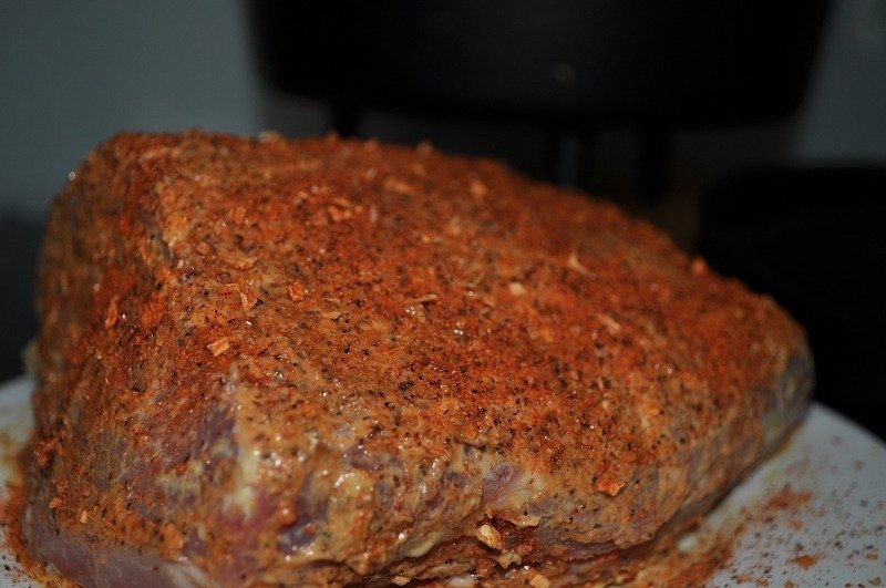 - Fleisch mit Senf bestreichen und den Rub darüber geben