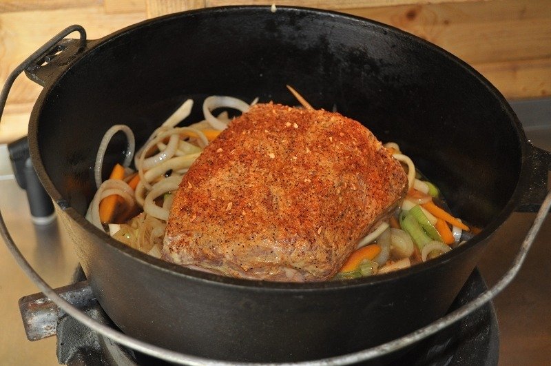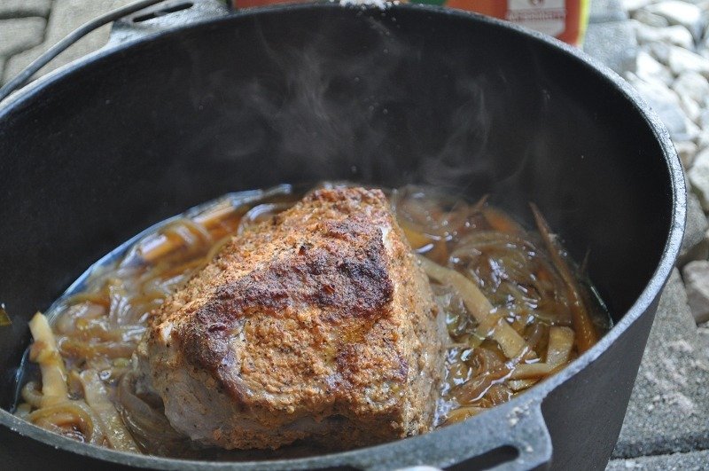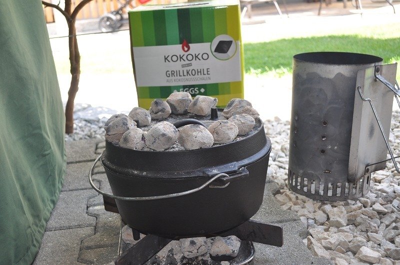 - Jetzt darf das Fleisch gute 3h vor sich hin köcheln, die Kohlenverteilung ist wie immer 1/3 unten und 2/3 oben, hier 6 unten und 12 oben. Wenn man unsicher ist, lieber ein wenig weniger Kohle, dann läuft man nicht Gefahr das etwas einbrennt.