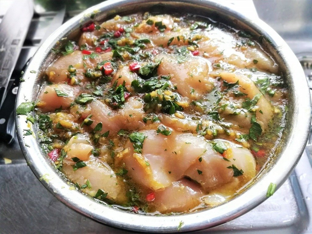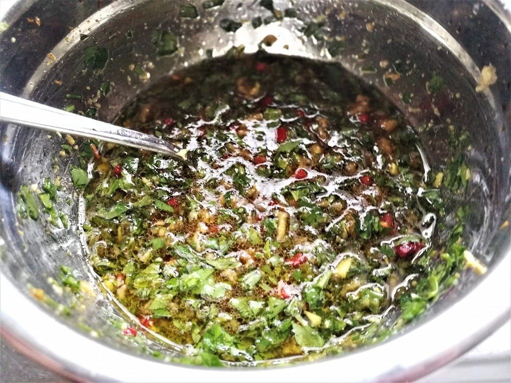 - Die Petersilie, Ingwer, Chili fein hacken, die Knoblauchzehen pressen und mit den restlichen Zutaten in einer verschließbaren Schüssel vermischen
