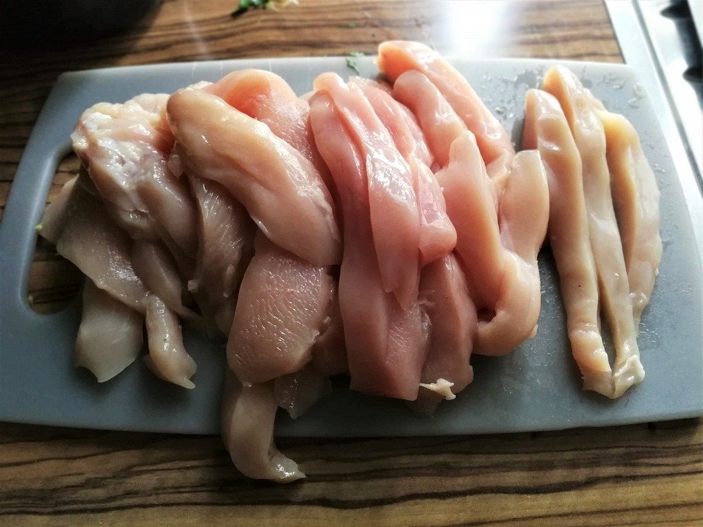 - Die Hähnchenbrüste säubern und ggf. parieren und längs in Streifen schneiden