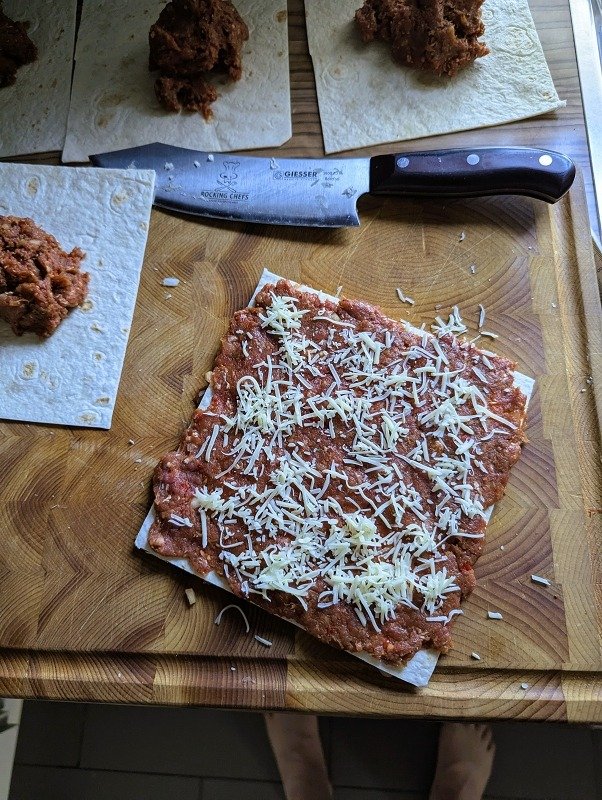 - Die Fladen auslegen und die Hackmasse gleichmäßig verteilen und beim ersten Fladen schön gleichmäßig bis zu den Ecken andrücken.