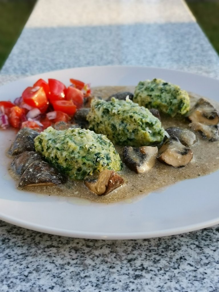 - Die Malfatti können vielfältig angerichtet werden, wie hier auf einer Pilzsauce, es schmeckt aber auch herrlich mit einer Tomatensugo.