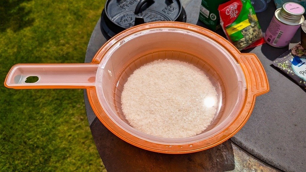 - Reis gut auswaschen und für 20 Minuten im Wasser einweichen