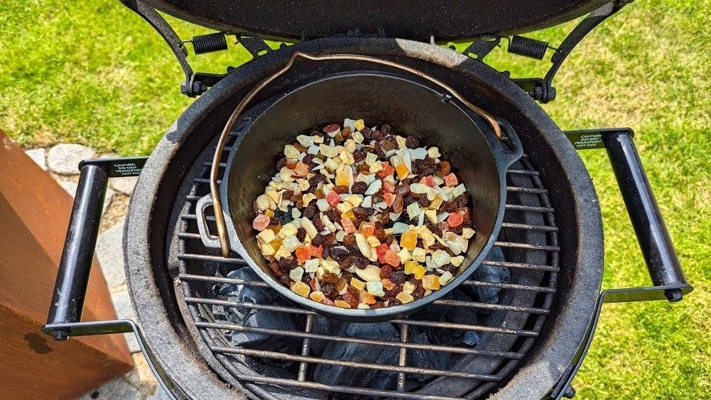 - Das Ghee im Dutch Oven schmelzen und die Trockenfrüchte darin anbraten