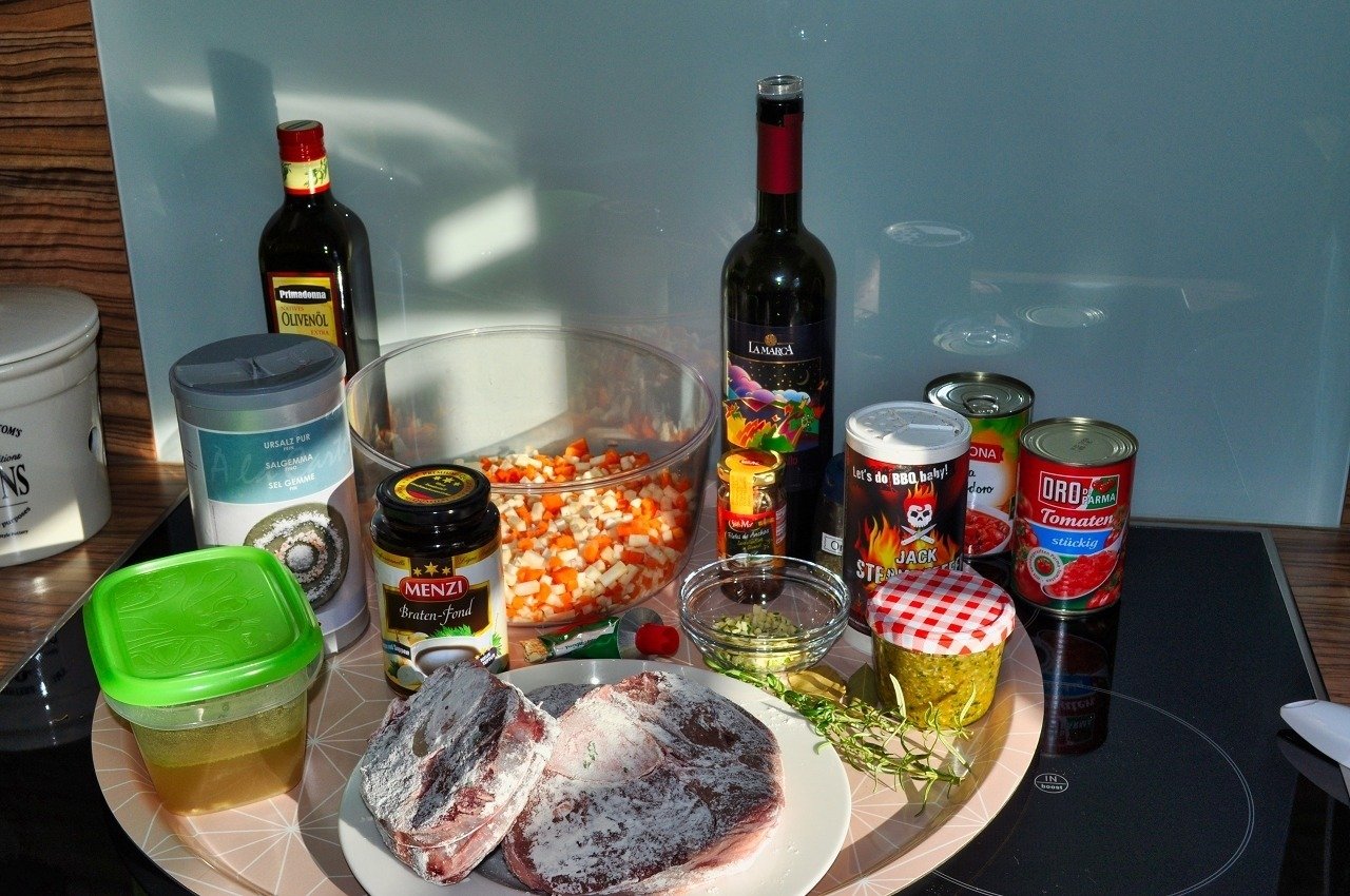 - Den Wein ein bisschen einreduzieren lassen und das Fleisch wieder zugeben. Jetzt kommen die restlichen Zutaten hinzu und werden für gut 3 Stunden geschmort.