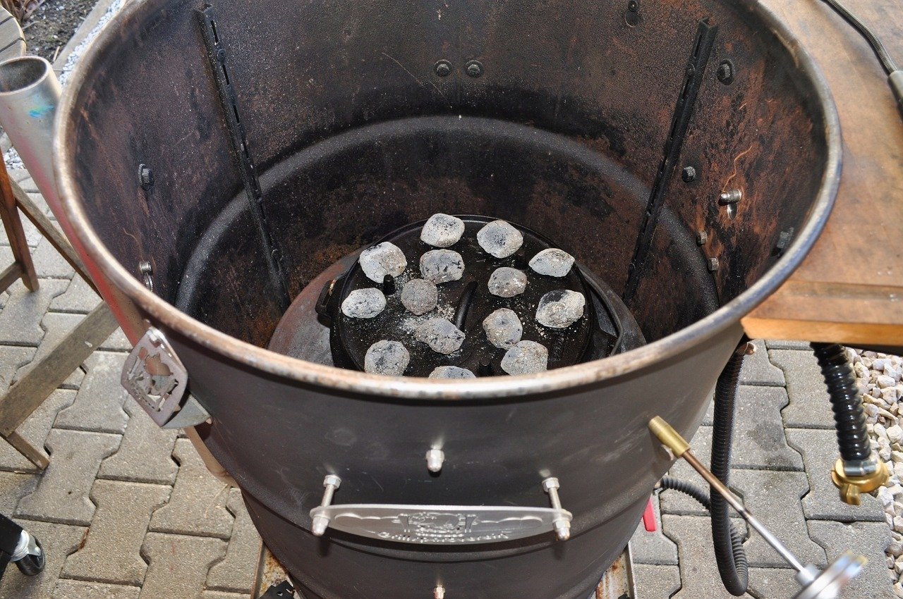 - Hierzu 6 Kohlen unten und 12 Kohlen oben legen bzw. 180-200 Grad im Gasgrill