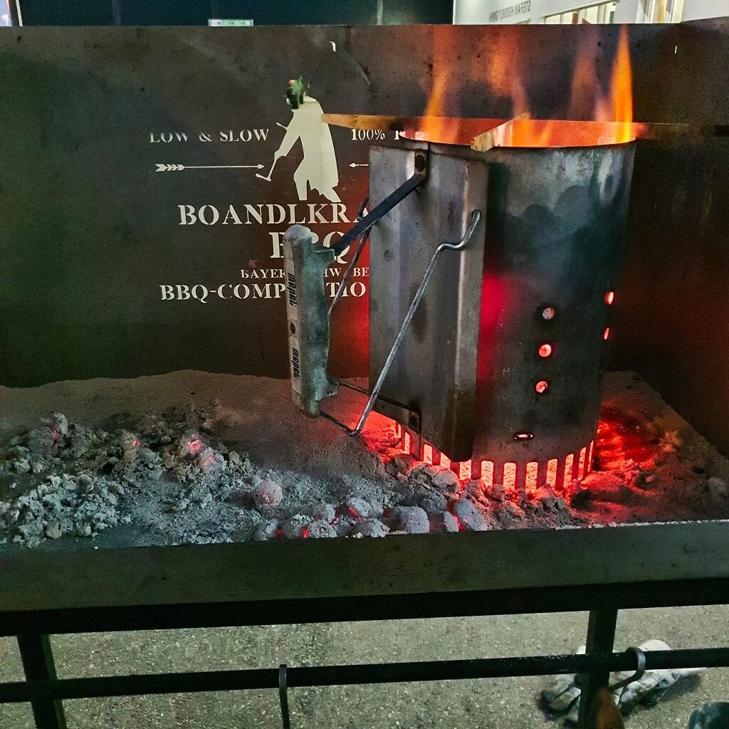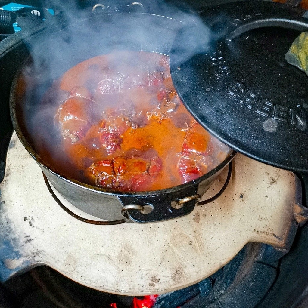 - 1 Dutch Oven ft6 von Petromax oder vergleichbar. Während die Kohlen im Anzündkamin vorglühen kann man mit Hilfe der AZK-App die Zutaten darauf anbraten. Alternativ Zubereitung im Grill bei 180 Grad möglich.Kohlensetup zum Schmoren: 4 unten, 10-12 oben