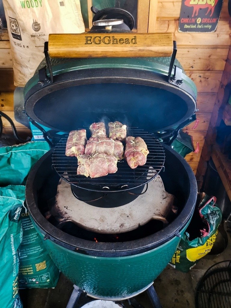 - Jetzt wird der Rinderfond zugegeben und der Durch Oven in den auf smoken vorbereiteten Grill (120 Grad) in den indirekten Bereich gestellt, ein Grillrost auf den Dutch Oven gelegt und darauf die vorbereiteten Rouladen gelegt. Mit Hilfe von Holzchunks oder Chips wird das ganze nun für 30-60Minuten gesmokt.