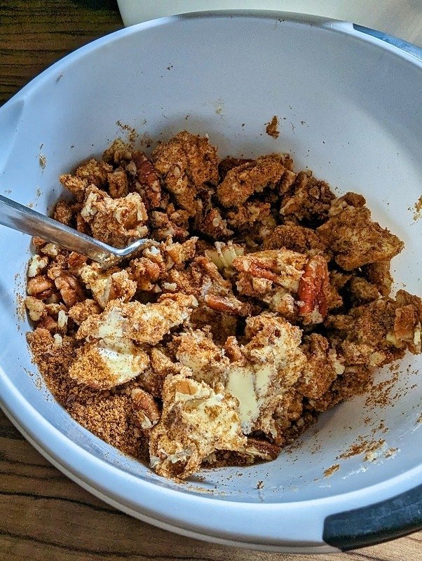 - Die weiche Butter mit den gehackten Pecannüssen und dem braunen Zucker zu einer homogenen Masse verarbeiten150 g Butter, 200 g Pecan Nüsse, 75 g Rohrohrzucker