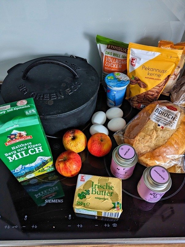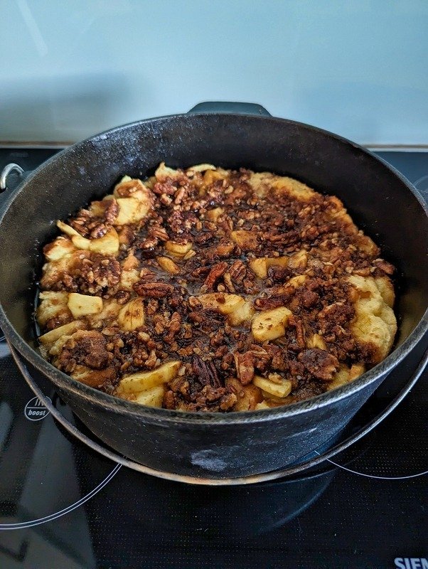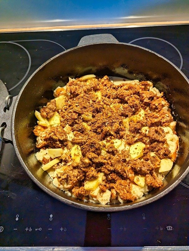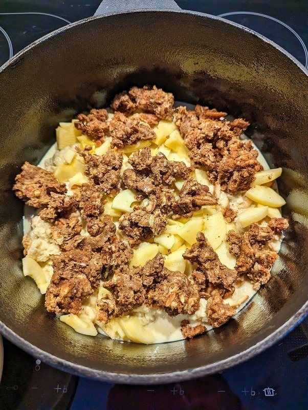 - Den Dutch Oven mit Trennspray, Butter oder Öl fetten und die Hälfte der Eiermilch Brioche Masse am Boden verteilen und darüber die Hälfte der Apfelscheiben und die Hälfte der Nussmasse geben3 Äpfel