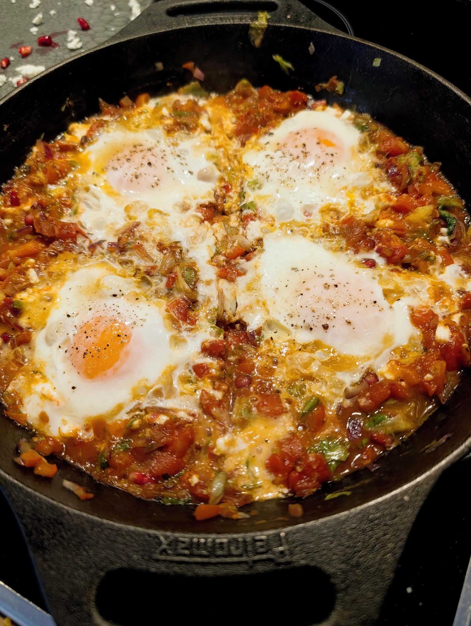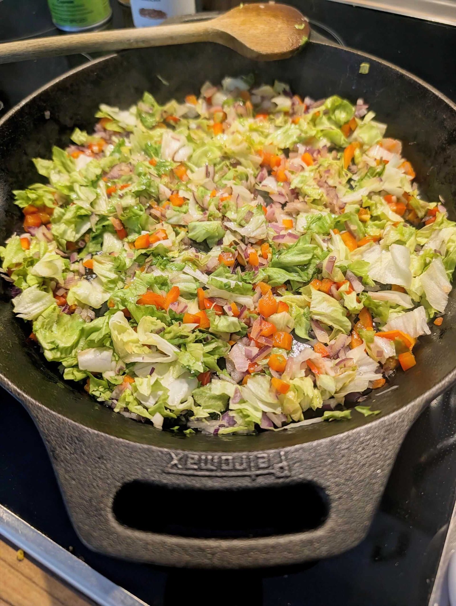 Beim Persischen Omelett ist das ‚Grün‘ der Motor des Gerichts. Der Babyspinat verhält sich in der Pfanne wie ein Teamplayer: Durch seine feine Struktur fällt er unter Hitzeeinwirkung schnell zusammen und verbindet sich fast nahtlos mit dem Tomatensud und den feinen Würfeln der roten Paprika zu einer seidigen Basis. Die Paprika bringt dabei eine dezente, karamellisierte Süße ein, die perfekt mit der Frische harmoniert.