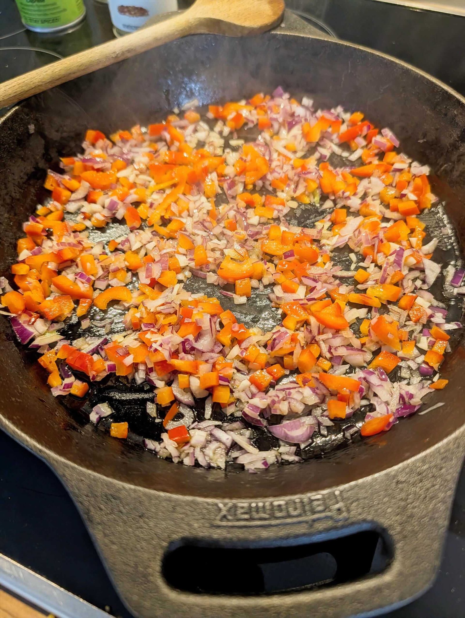 - Die gewürfelte rote Paprika hinzugeben und ebenfalls andünsten.1 rote Paprika