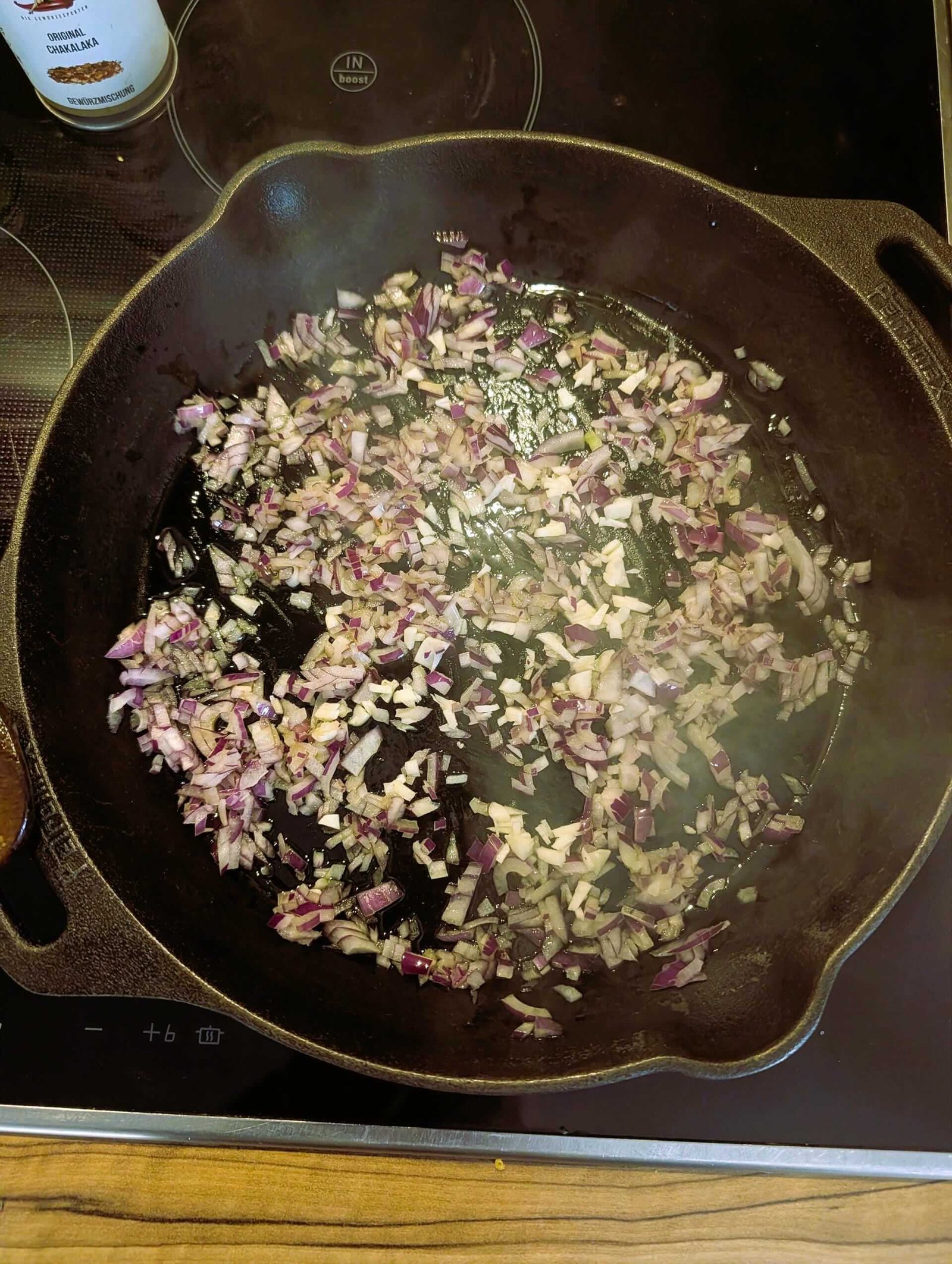 - Zwei rote Zwiebeln und Knoblauch würfeln, im Olivenöl glasig dünsten.3 rote Zwiebeln, 3 Knoblauchzehen, 1 EL Olivenöl