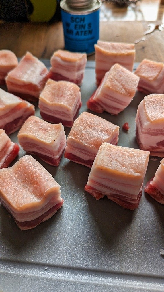 - Bevor es weitergeht wird das Salz mit einem feuchten Tuch von der Schwarte gewischt und der Bauch in 3 cm Würfel geschnitten