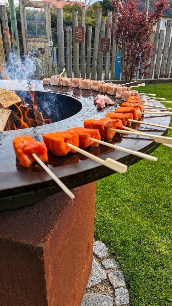 - Holzspieße wässern: Wenn du die Würfel auf Spieße steckst, wässere die Holzspieße vorher kurz, damit sie auf der heißen Platte nicht verbrennen.