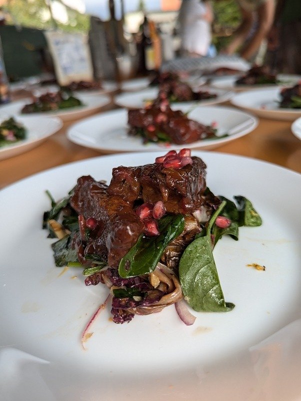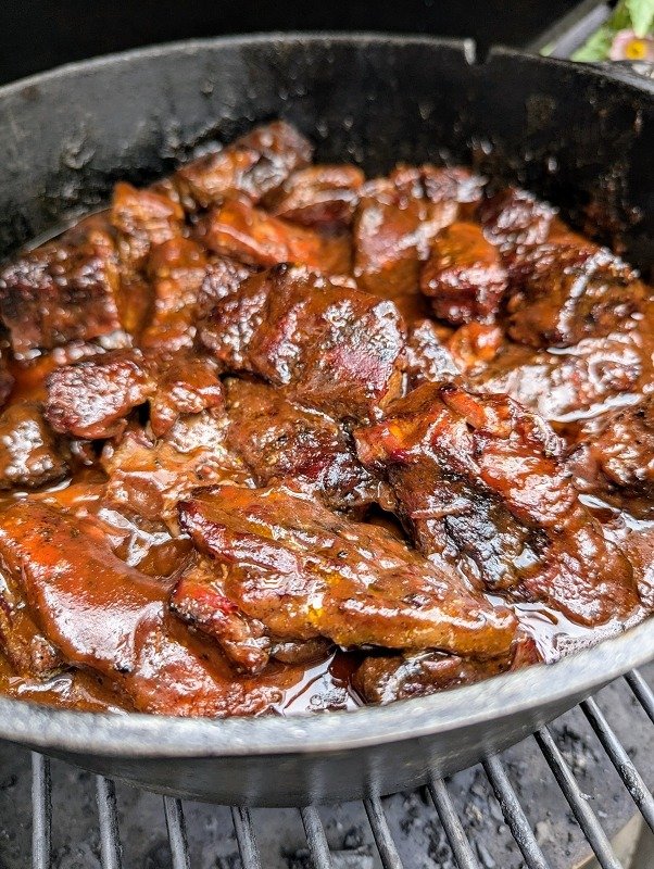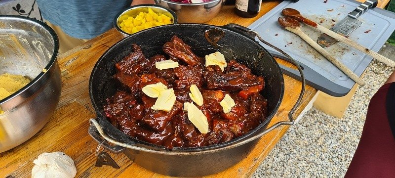 - Der Dutch Oven kommt nun zurück auf den Grill (ohne Deckel), die Temperatur bleibt bei 150-160 Grad für gut 30-60 Minuten bis die Soße karamellisiert ist.