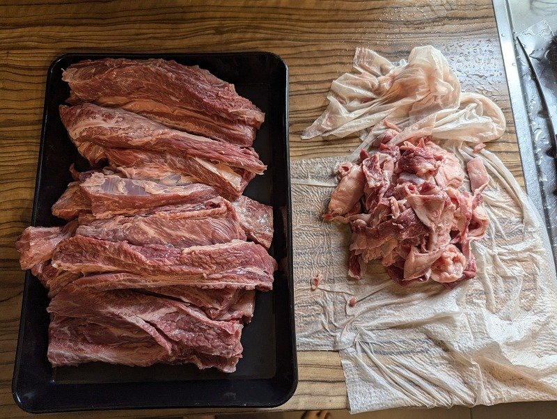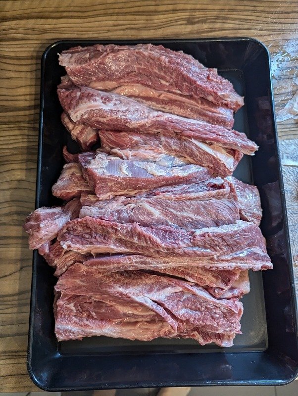 Beim Rind können die Zuschnitte aus allen Rippen Cuts, genauer gesagt das Fleisch zwischen den Rippenbögen (Intercostal-Fleisch) hergestellt werden. Ich bevorzuge aber die Querrippe, da diese am günstigsten ist. Zudem ist Rind wesentlich kräftiger im Geschmack.