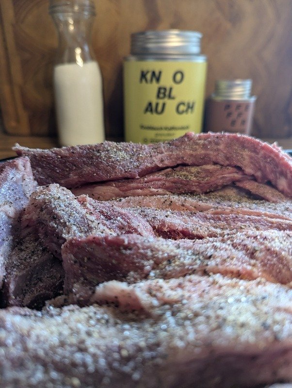 Beim Schwein haben wir in Deutschland das Problem das die Fleischauflage über den Rippen sehr gering ist, deshalb sollte hier der St. Louis Cut gewählt werden. Auch sollte man bei der Rasse am besten Iberico nehmen, das ist nussiger und das Fett zarter.