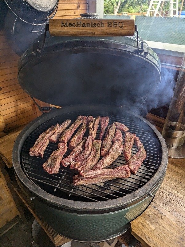 Alternativ kann man die Dämpfphase entfallen lassen, dafür regelmäßig die Zuschnitte auf dem Grill besprühen, dies sorgt für mehr Kruste, aber auch für eine längere Garzeit, je nach Fleischdicke um 1-2 Stunden.