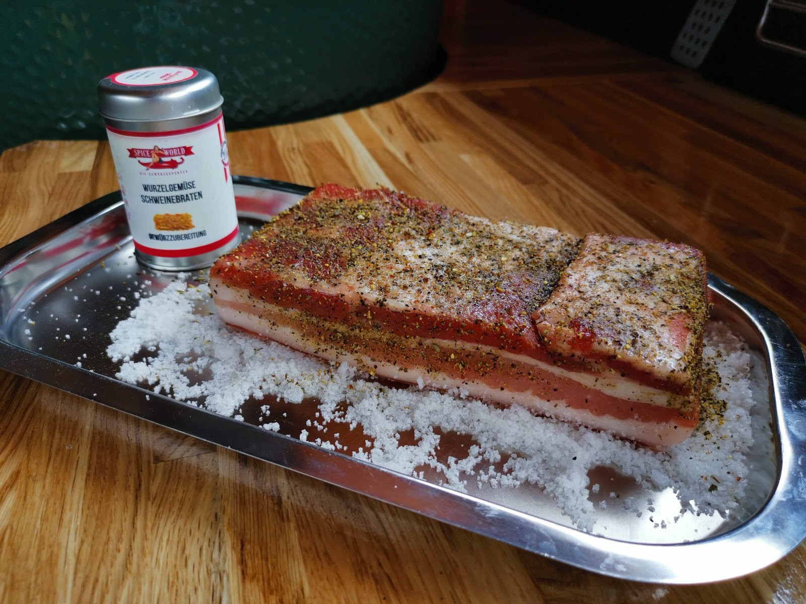- Den Schweinebauch am besten über Nacht, aber mindestens 4 Stunden vorher auf die nicht eingeschnittene Schwarte das Salz verteilen und mit dieser Seite in einen Behälter legen. Durch dies wird die Feuchtigkeit aus der Schwarte genommen, was später das aufknuspern erleichtert. Die Fleischseite mit dem Gewürz einreiben und das ganze bis zur Zubereitung abgedeckt in den Kühlschrank legen. Das Fleisch maximal mit einem Küchentuch abdecken, aber nicht in Frischhaltefolie einwickeln, durch dies entsteht unnötig Feuchtigkeit an der Schwarte.