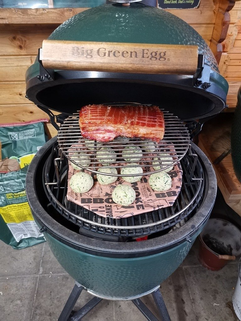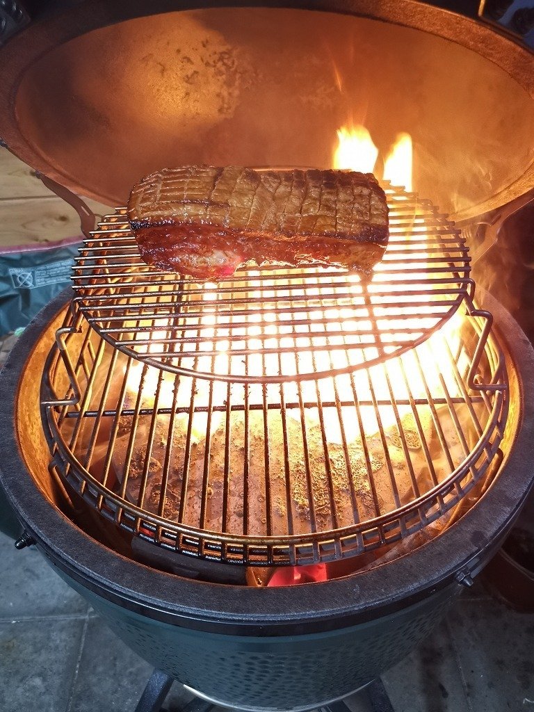 - Den Grill auf indirektes grillen und 120 Grad einregeln und den Schweinebauch mit der Schwarte nach oben für ca. zwei Stunden und einer Kerntemperatur von 70 Grad ziehen lassen.