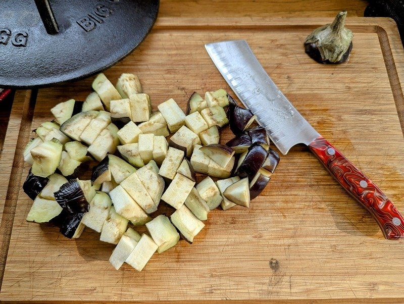 - Nun nehmen wir die Aubergine, schneiden den Strunk ab und würfeln die Aubergine in max. 1 cm große Würfel.1 Aubergine