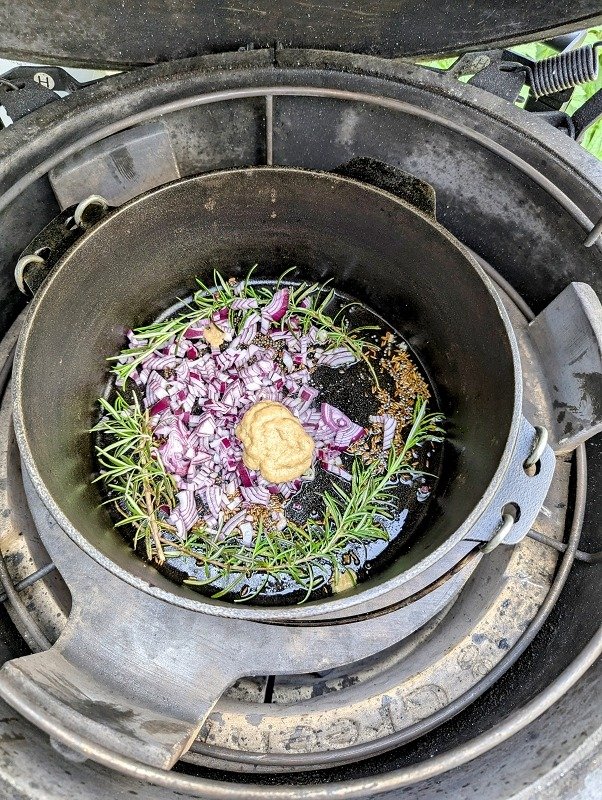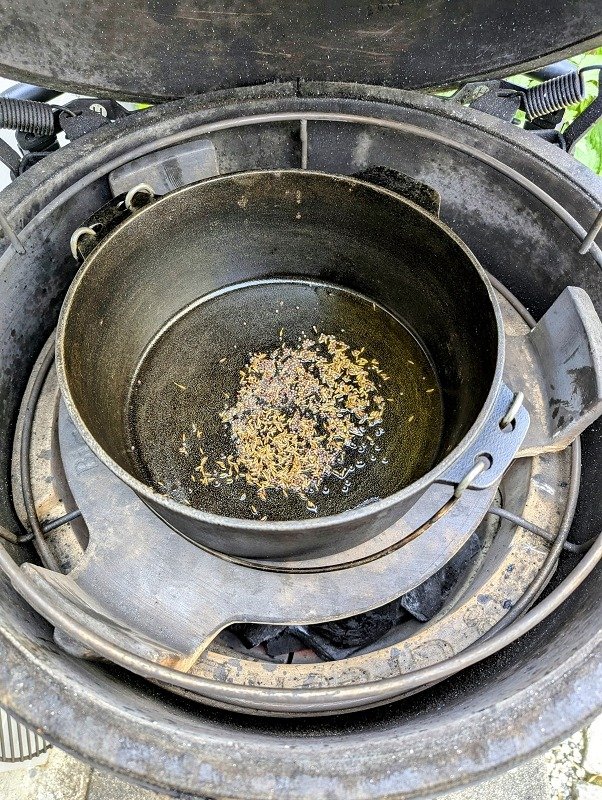 - Den Dutch Oven im Grill mit dem Ghee vorheizen und Kurkuma, Chilipulver, Kardamom, Senfsaat und Kreuzkümmel anrösten, dadurch wird das Ghee durch die austretenden Öle aromatisiert1 EL schwarze Senfsamen, 2 grüne Kardamomkapseln, 1 TL Kurkuma, 1 MS Chillipulver, 1 EL Ghee, 1 EL Kreuzkümmelsamen