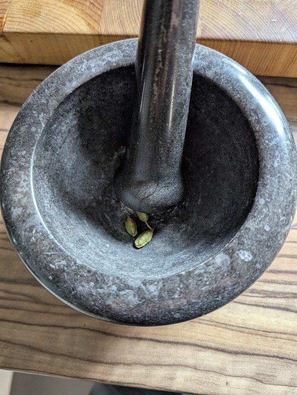- Die Kardamom Samen fein mörsern.