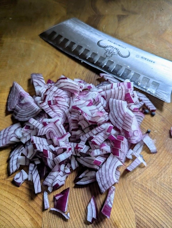 - Die Zwiebeln fein würfeln und …1 rote Zwiebel