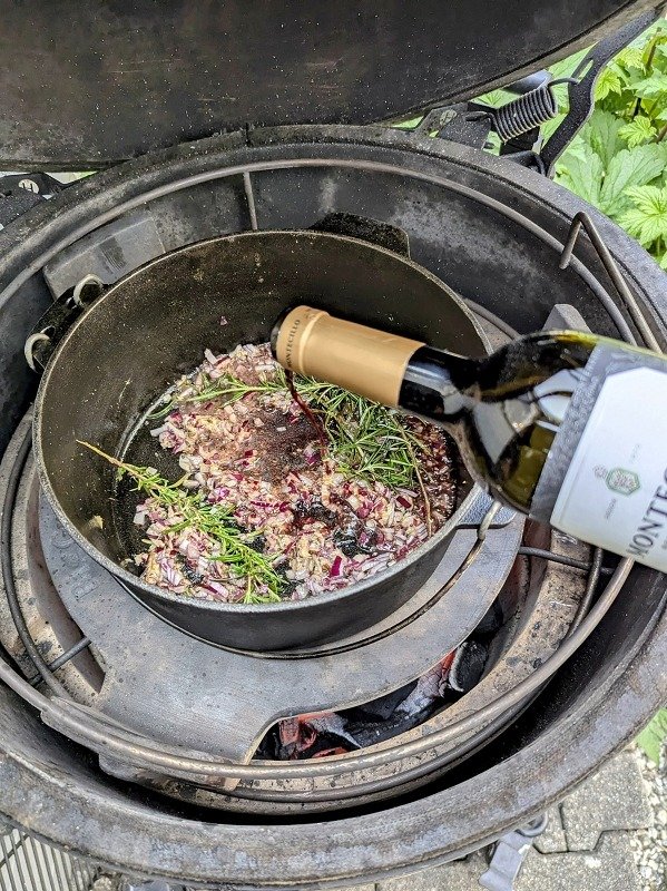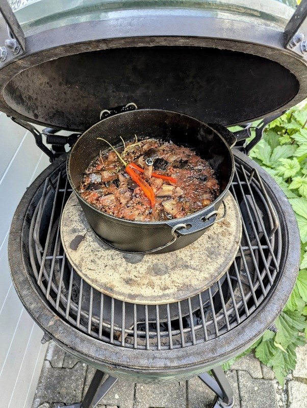 - Zum schmoren legen wir die rote Chili on top und stecken noch eine Zimtstange in die Mitte und zünden diese an, das Aroma ist wunderbar und bleibt dank verschlossenem Deckel auch im Gericht. Die Temperatur sollte 160 Grad im Grill nicht überschreiten.1 Zimtstange, 1 rote Peperoni