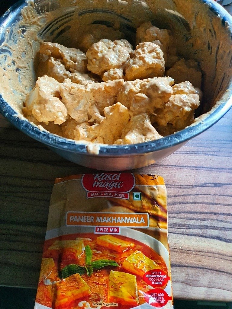 - Den Blumenkohl zur Marinade geben, gut vermischen und eine Stunde abgedeckt im Kühlschrank marinieren lassen.