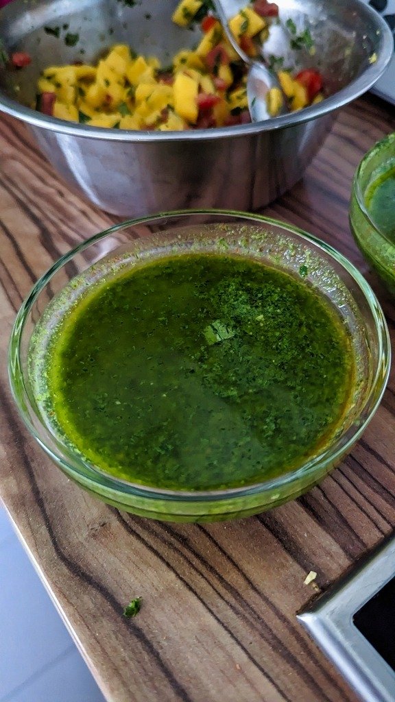 Zum Paneer passt hervorragend eine Mangosalsa und eine Koriander Sauce, welche ich hier gleich mit in die Rezeptkarte übernommen habe. Somit hat man ein komplettes Gericht. Wer will kann sich noch Naan dazu machen, alternativ wie hier im Rezeptbild zu sehen einen Tortilla Fladen. Dieser wird kurz über direkter Grillhitze oder in einer Pfanne angeröstet, wer will kann diesen dann noch mit Knoblauchbutter bestreichen.