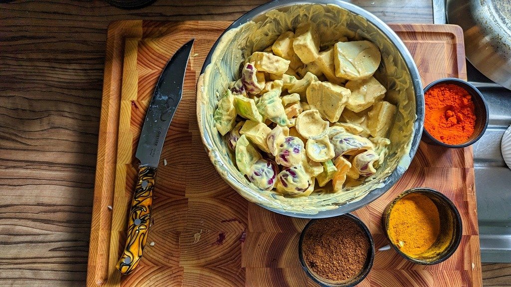 - Darin werden nun die Zwiebel, Paprika und Paneer für mindestens 30 Minuten eingelegt