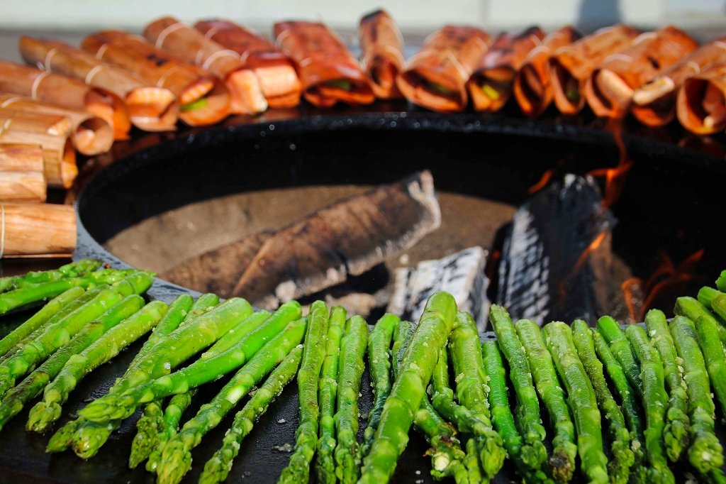 - Die Wood Sheets mindestens 30 Minuten vor dem Grillen in lauwarmen Wasser einweichen. Den Portionslachs waschen, mit Olivenöl einreiben und leicht salzen. Die Limetten halbieren und in dünne Scheiben schneiden, je zwei mittig auf die Wood Sheets legen, darauf den Lachs platzieren und die Seiten des Wood Sheets über dem Lachs zusammenklappen und mit Küchengarn sichern (dies bei allen wiederholen). Nun kommt der Lachs bei 200-220 Grad bei direkter Hitze in den Grill oder auf eine Plancha. Alle 3 Minuten um 90 Grad wenden bis alle Seiten angegrillt sind. Zeitgleich die Spargelstangen bei gleicher Temperatur grillen, nach 10 Minuten vom Grill nehmen und mit Salz und Öl leicht marinieren.