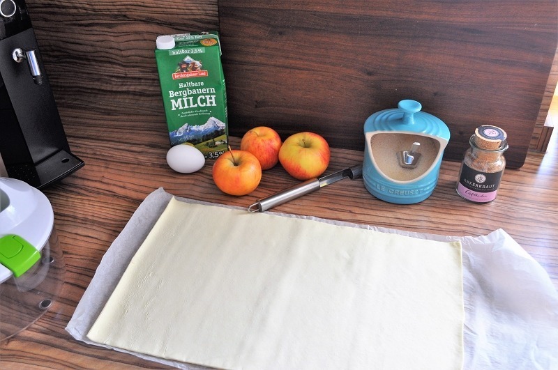 - Nun mittels eines Pizzarollers oder Messer unterhalb des Apfels den Blätterteig durchschneiden und den Teigstreifen aufrollen und mit dem überlappenden Teil verschließen.