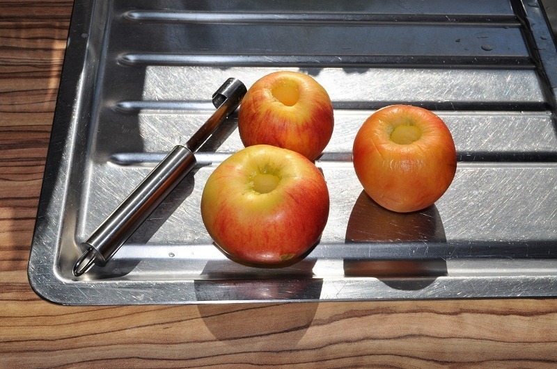 - Zuerst die Äpfel waschen, das Kernhaus ausstechen, die Äpfel längs hablbieren, in dünne Halbringe hobeln und mit 2EL Zitronensaft gegen oxidieren schützen.