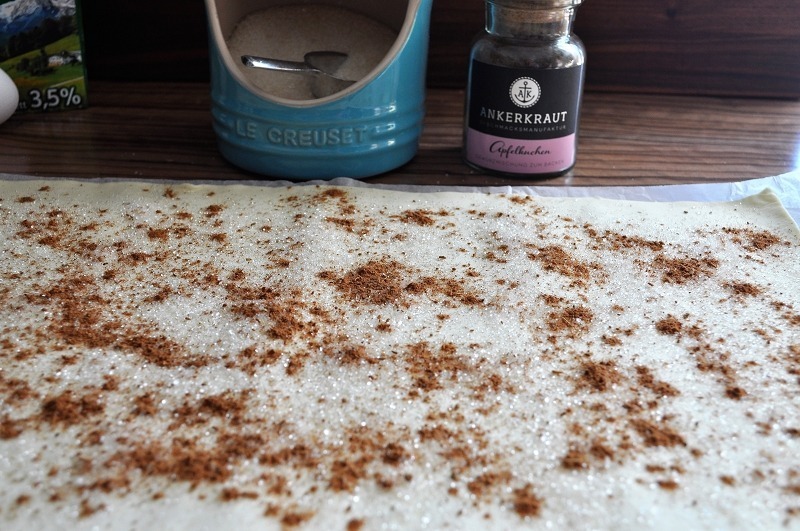 - Nun den Blätterteig ausrollen und mit der Zucker-Zimt-Mischung bestreuen
