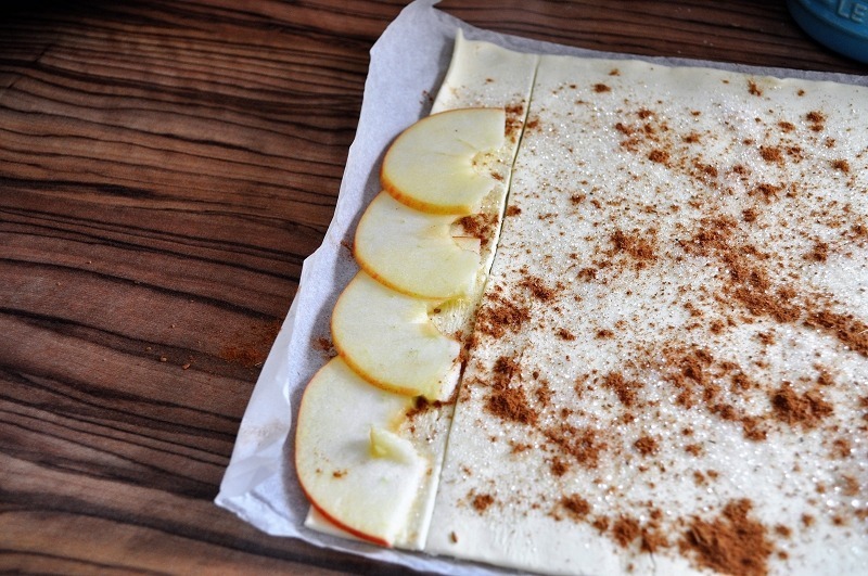 - Jetzt die Apfelstreifen zu ⅓ überlappend quer zum Blätterteig anschichten, am Ende ein Stück ohne Apfel frei lassen zum verschließen.