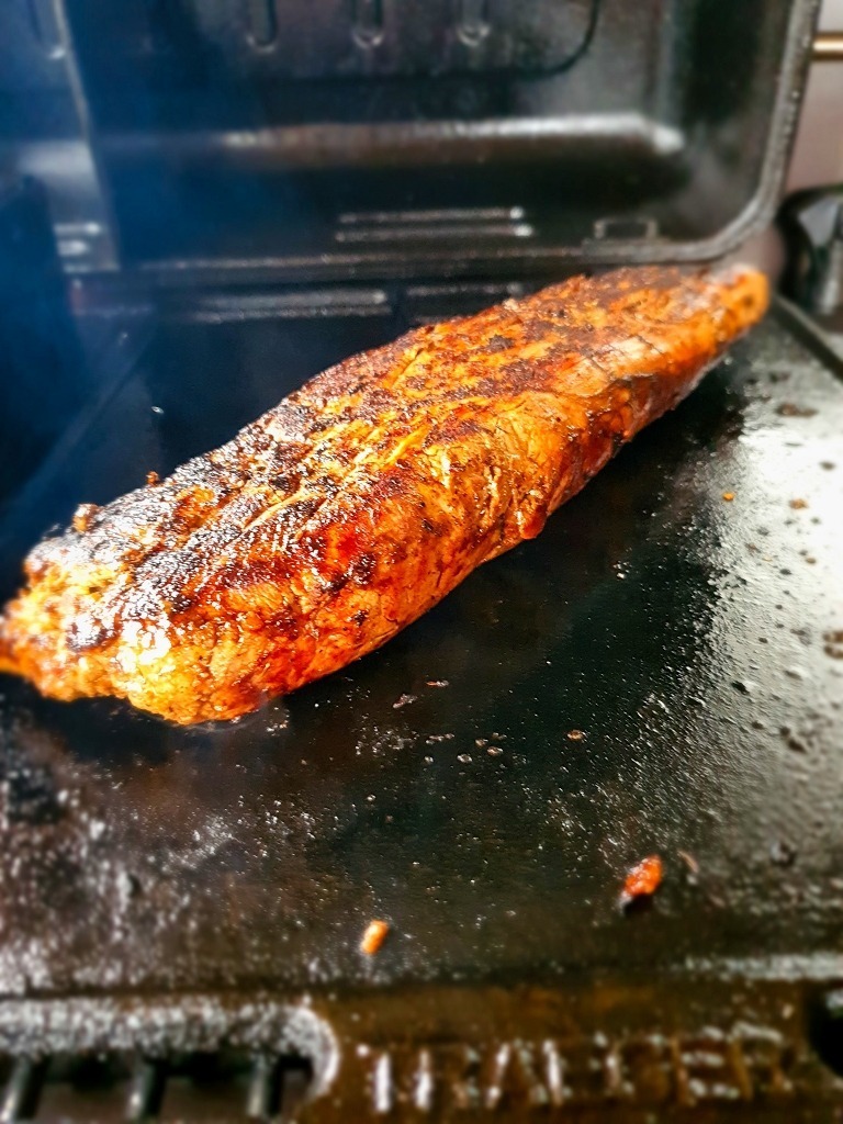 - Das Fleisch von der Marinade mit einem Küchenkrep grob abtupfen und mit dem Jerkgewürz leicht nachwürzen. Jetzt kommt das Fleisch auf den Grill, bei direkter Hitze bei ca. 250-280 Grad, je nach Grill. Wenn das Fleisch rundherum angebraten ist kommt es in die indirekte Zone bis es eine Kerntemperatur von 62-64 Grad erreicht hat und außerhalb des Grills zum ruhen noch 5 Minuten beiseitegelegt.