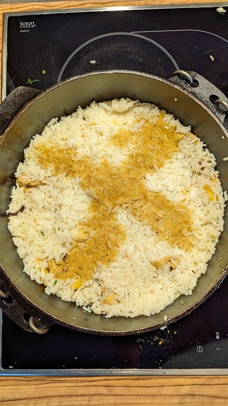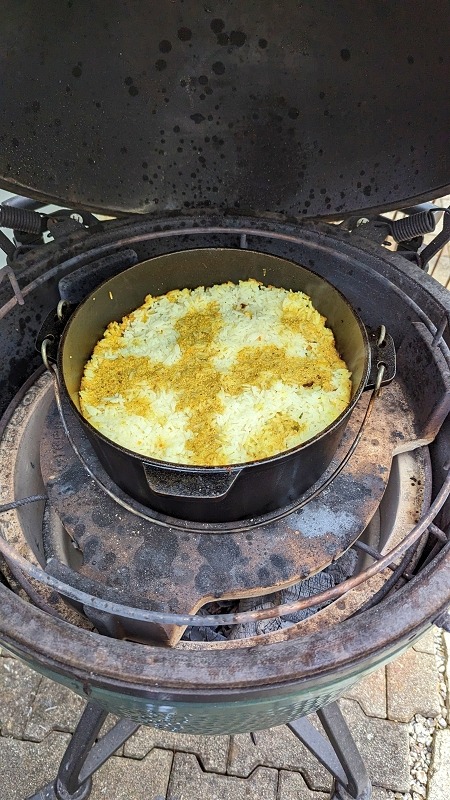 - Zum Schluss der restliche Reis, oben drüber kommt noch die Safran Milch Mischung, bevor es in den auf 160 Grad eingeregelten Grill bei indirekter Hitze für 30 Minuten geht. Die Temperatur sollte nicht zu hoch sein, sonst brennen die Zutaten am Boden an.4 Fäden Safran, 50 ml Milch