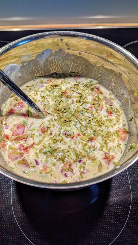 - Alle Zutaten zu einem Salat vermengen und kalt stellen1 Gurke, 3 Cocktail Strauchtomaten, 1 rote Zwiebel, 250 g griechischer Joghurt, ¼ Bund Minze, ¼ Bund Korinader, 1 Knoblauchzehe, ¼ TL Garam Masala Gewürz, ¼ TL Salz, 1 Zitrone