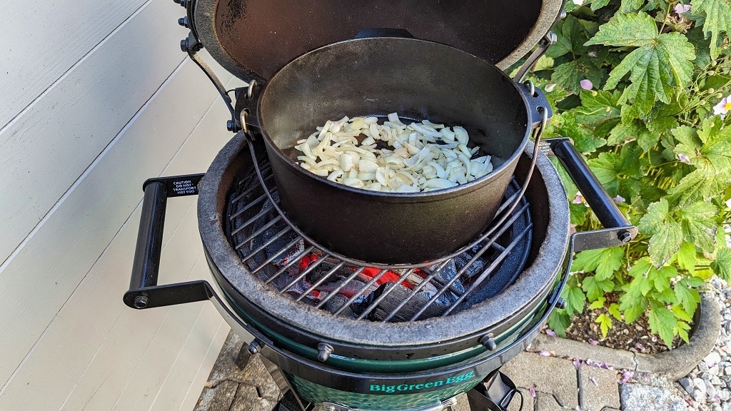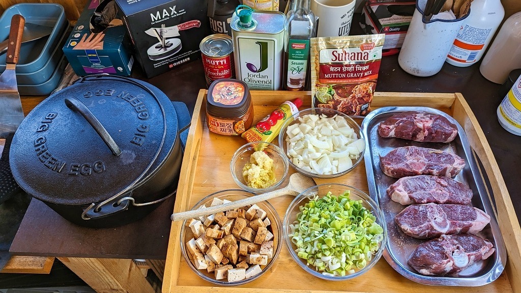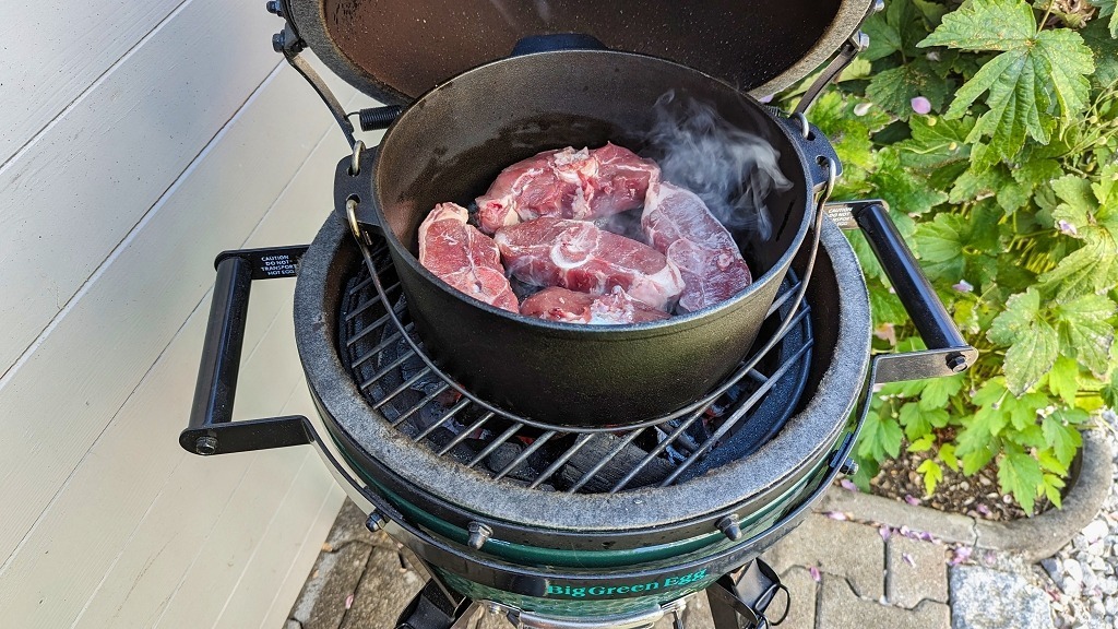 - Wenn der Grill heiß ist, bzw. die Kohlen glühen kann man den Dutch Oven anstellen, das Sesamöl hinzugeben und das Fleisch auf beiden Seiten kurz anbraten.
