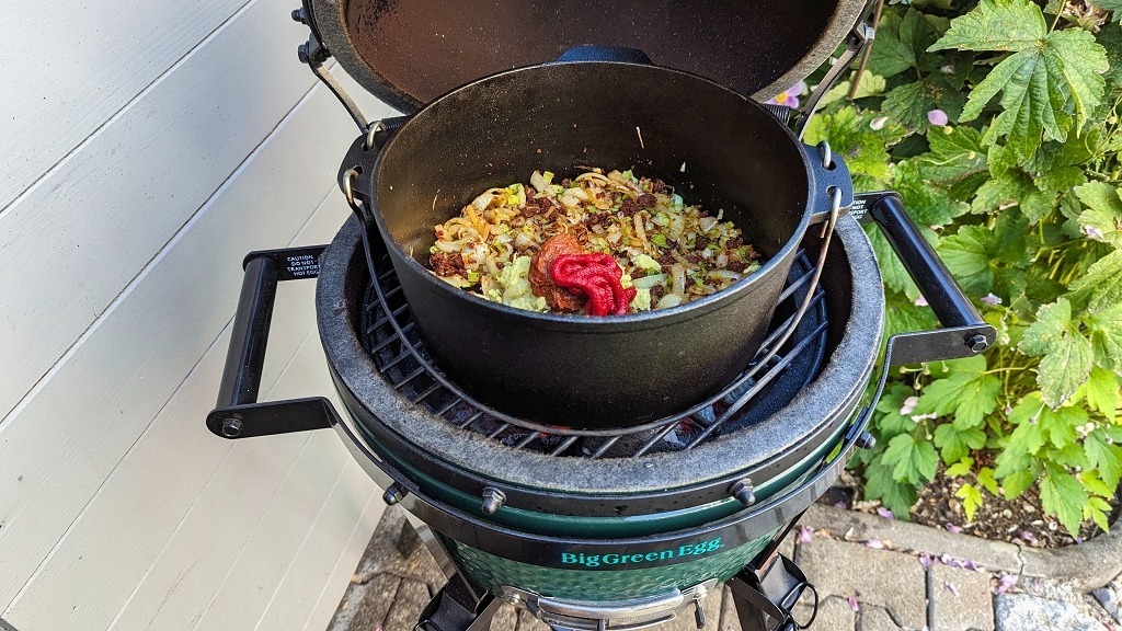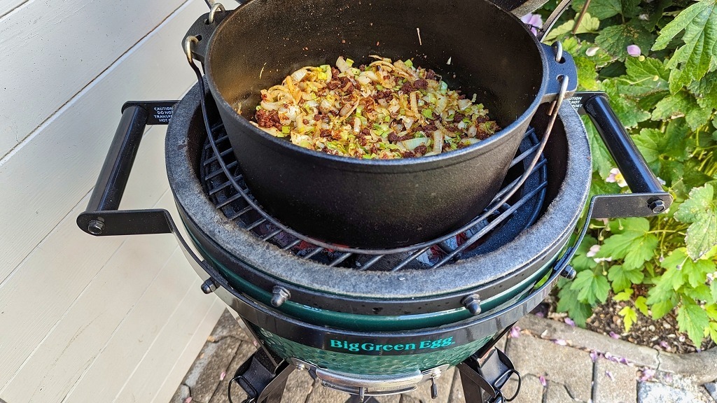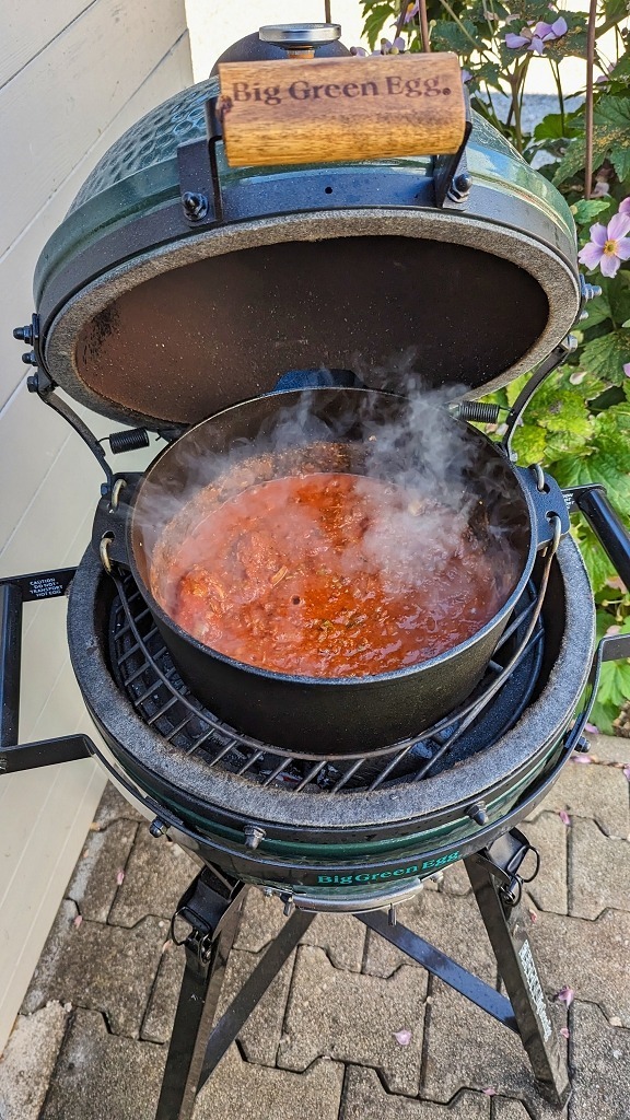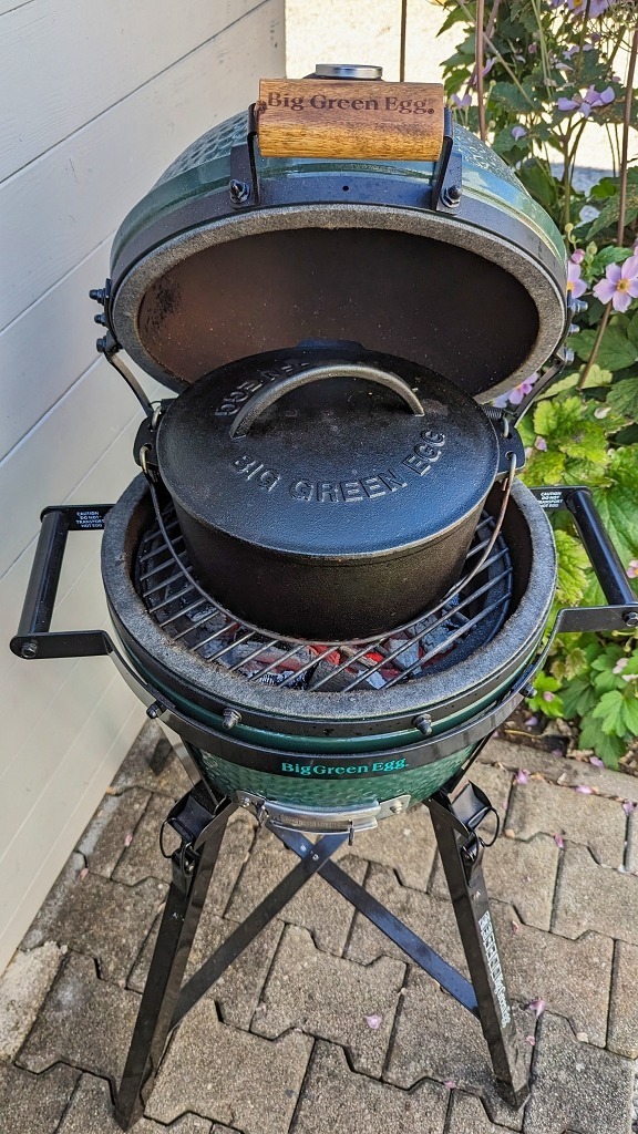 - Eine bis 1,5 Stunden schmoren lassen, bei Verwendung von Kohlen kommen 4 Stück unter den Top und 8 Stück auf den Deckel, ganz außen angeordnet.